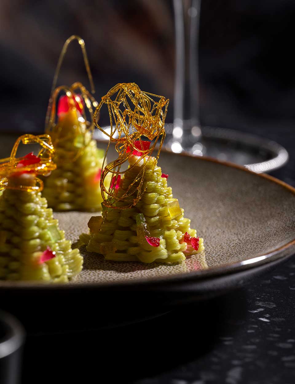 Durum wheat semolina pasta with spirulina and safflower concentrate, 3D extruded.